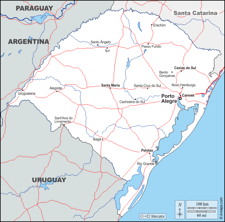d-maps > महाअमेरिका > ब्राज़ील > रियो ग्रांडे डो सुल राज्य > सीमाओं, जल-सर्वेक्षण, मुख्य शहरों, सड़कों, नाम