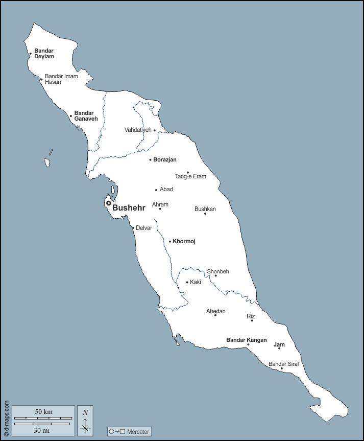 d-maps > एशिया > ईरान > बुशहर प्रांत > बाह्यरेखा, जल-सर्वेक्षण, मुख्य शहरों, नाम