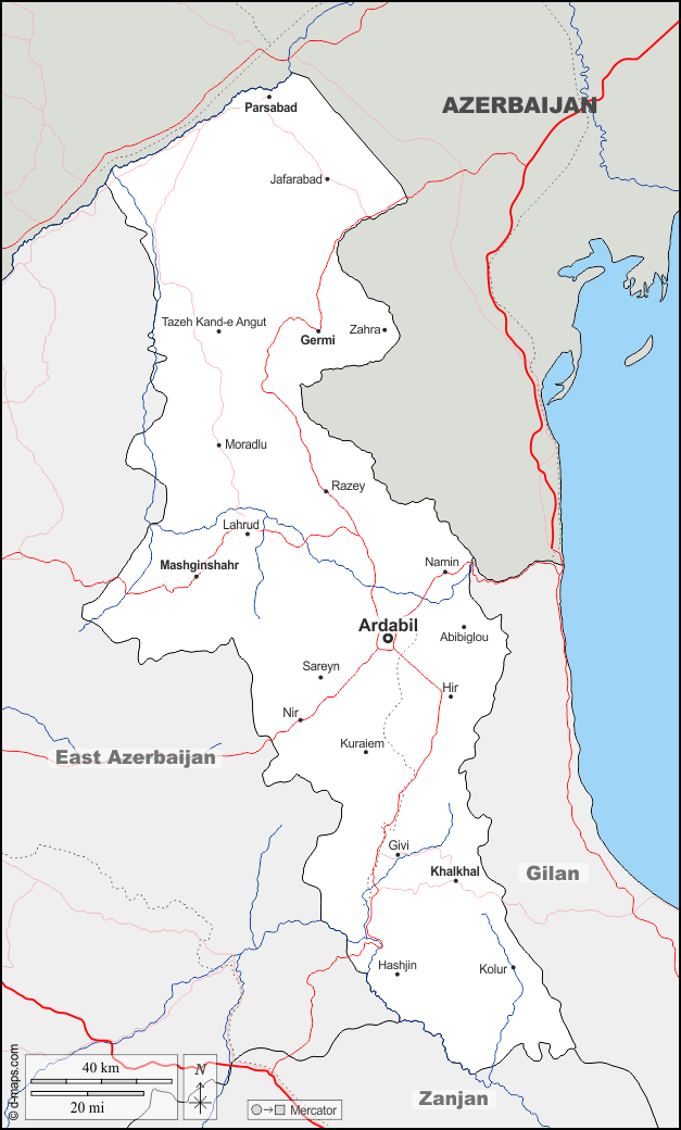d-maps > एशिया > ईरान > अर्दबील प्रांत > सीमाओं, जल-सर्वेक्षण, मुख्य शहरों, सड़कों, नाम