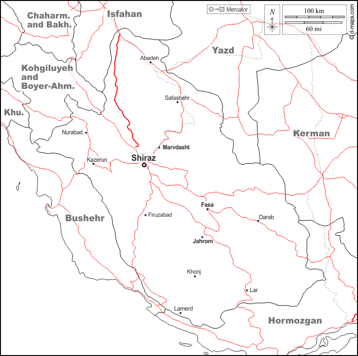 d-maps > एशिया > ईरान > फ़ार्स > सीमाओं, मुख्य शहरों, सड़कों, नाम, सफेद