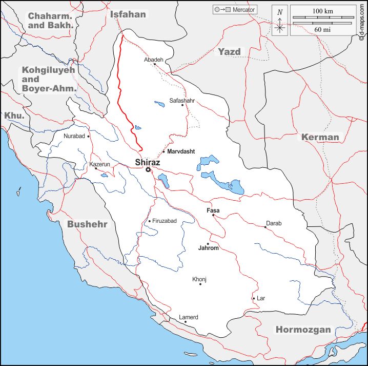 d-maps > एशिया > ईरान > फ़ार्स > सीमाओं, जल-सर्वेक्षण, मुख्य शहरों, सड़कों, नाम