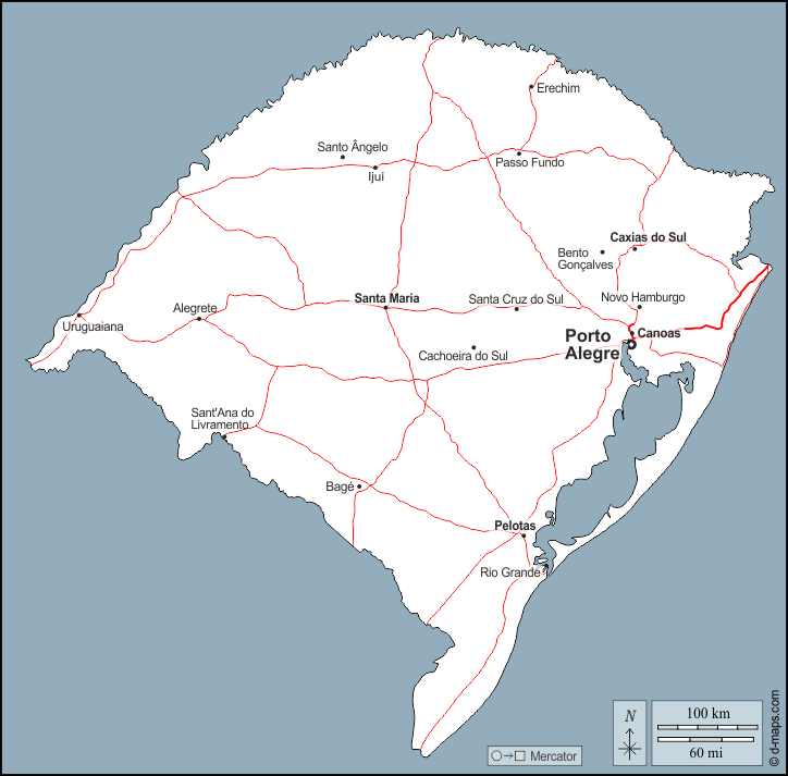 d-maps > महाअमेरिका > ब्राज़ील > रियो ग्रांडे डो सुल राज्य > बाह्यरेखा, मुख्य शहरों, सड़कों, नाम