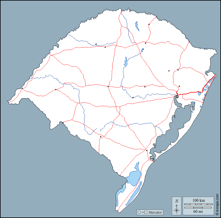 d-maps > महाअमेरिका > ब्राज़ील > रियो ग्रांडे डो सुल राज्य > बाह्यरेखा, जल-सर्वेक्षण, मुख्य शहरों, सड़कों