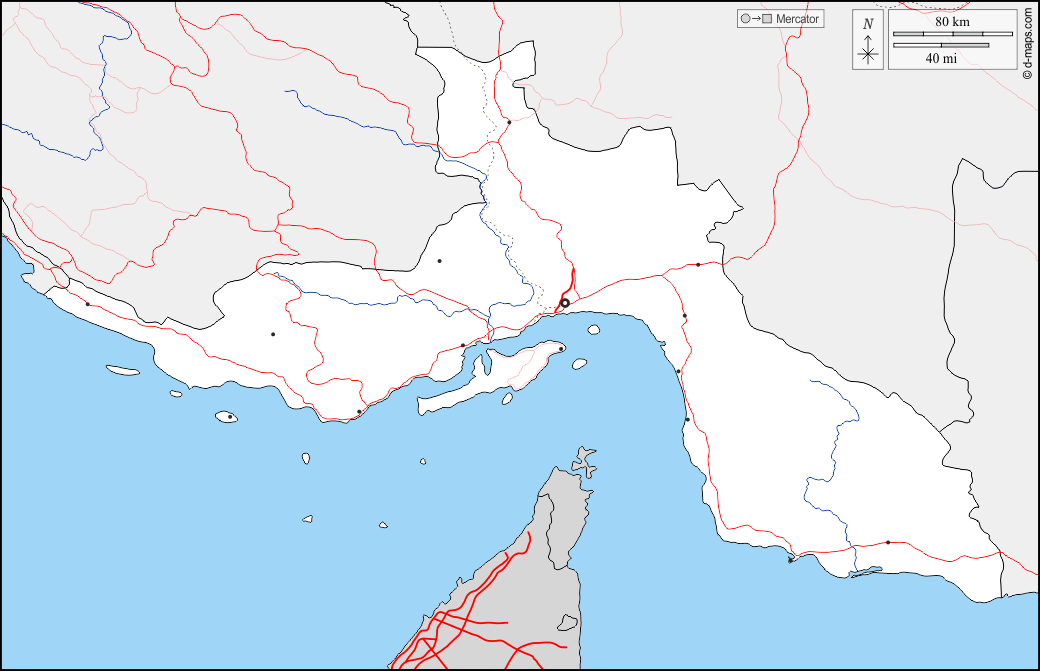 d-maps > एशिया > ईरान > होर्मोज़्गान प्रांत > सीमाओं, जल-सर्वेक्षण, मुख्य शहरों, सड़कों