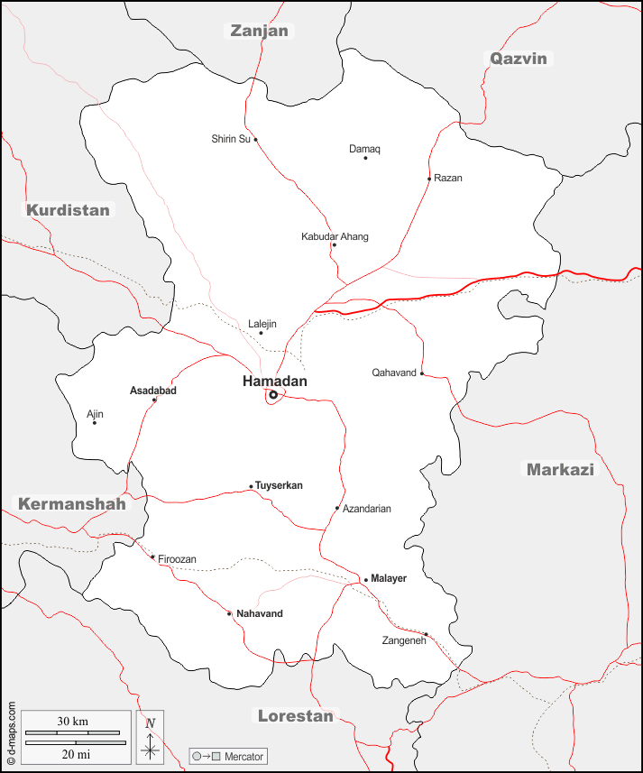 d-maps > एशिया > ईरान > हमादान प्रांत > सीमाओं, मुख्य शहरों, सड़कों, नाम