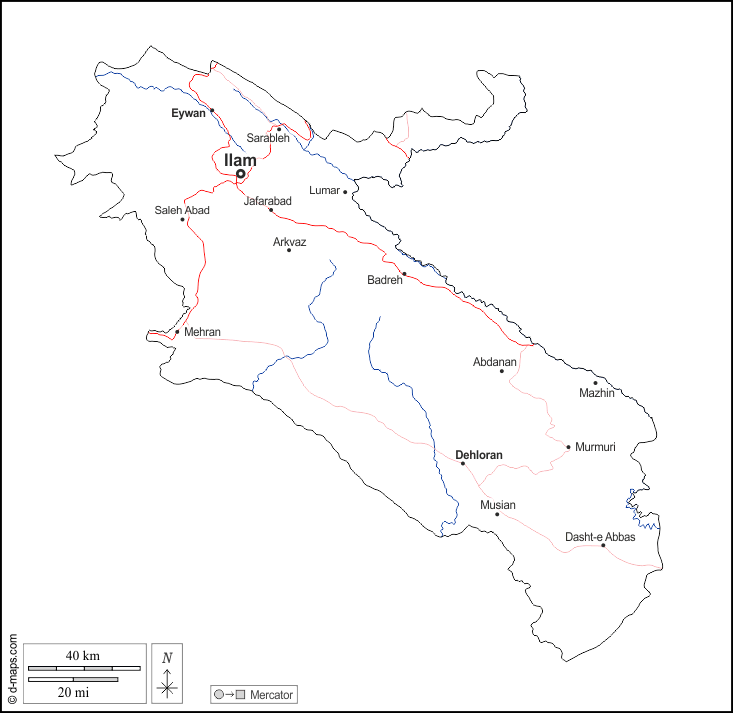 d-maps > एशिया > ईरान > ईलाम प्रांत > बाह्यरेखा, जल-सर्वेक्षण, मुख्य शहरों, सड़कों, नाम, सफेद