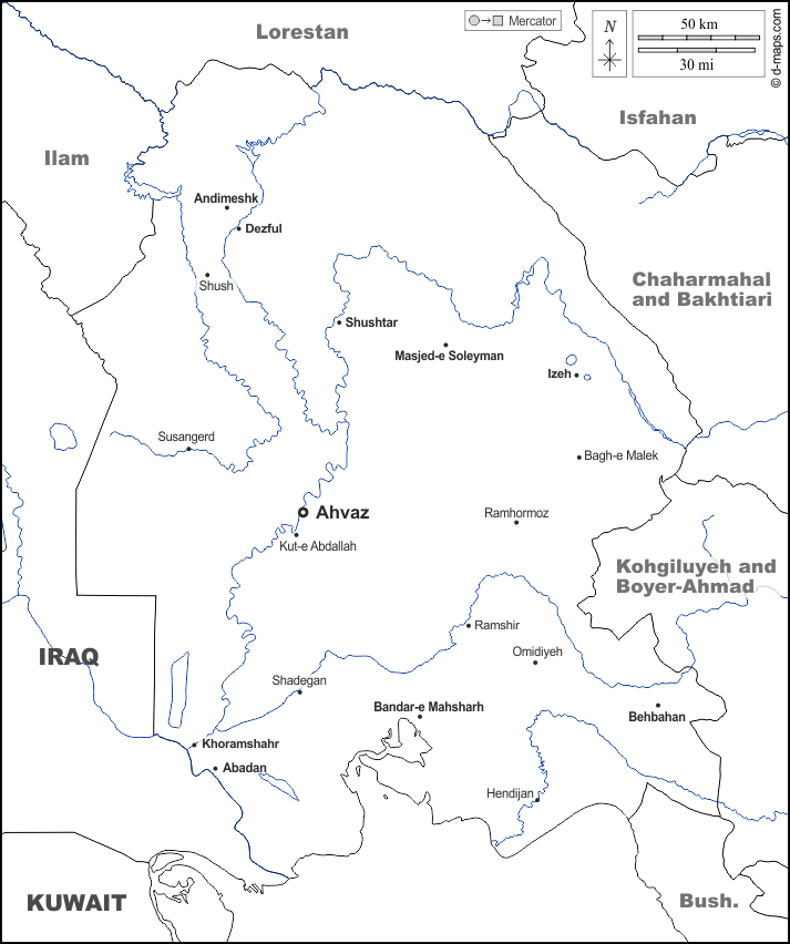 d-maps > एशिया > ईरान > ख़ूज़स्तान > सीमाओं, जल-सर्वेक्षण, मुख्य शहरों, नाम, सफेद