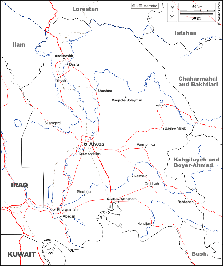 d-maps > एशिया > ईरान > ख़ूज़स्तान > सीमाओं, जल-सर्वेक्षण, मुख्य शहरों, सड़कों, नाम, सफेद
