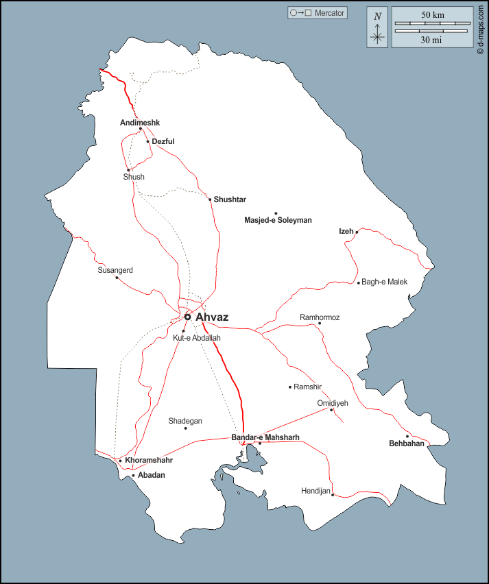 d-maps > एशिया > ईरान > ख़ूज़स्तान > बाह्यरेखा, मुख्य शहरों, सड़कों, नाम
