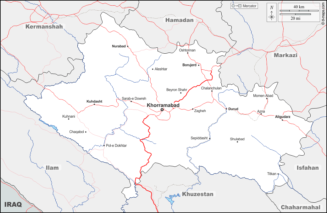 d-maps > एशिया > ईरान > लूरिस्तान > सीमाओं, जल-सर्वेक्षण, मुख्य शहरों, सड़कों, नाम