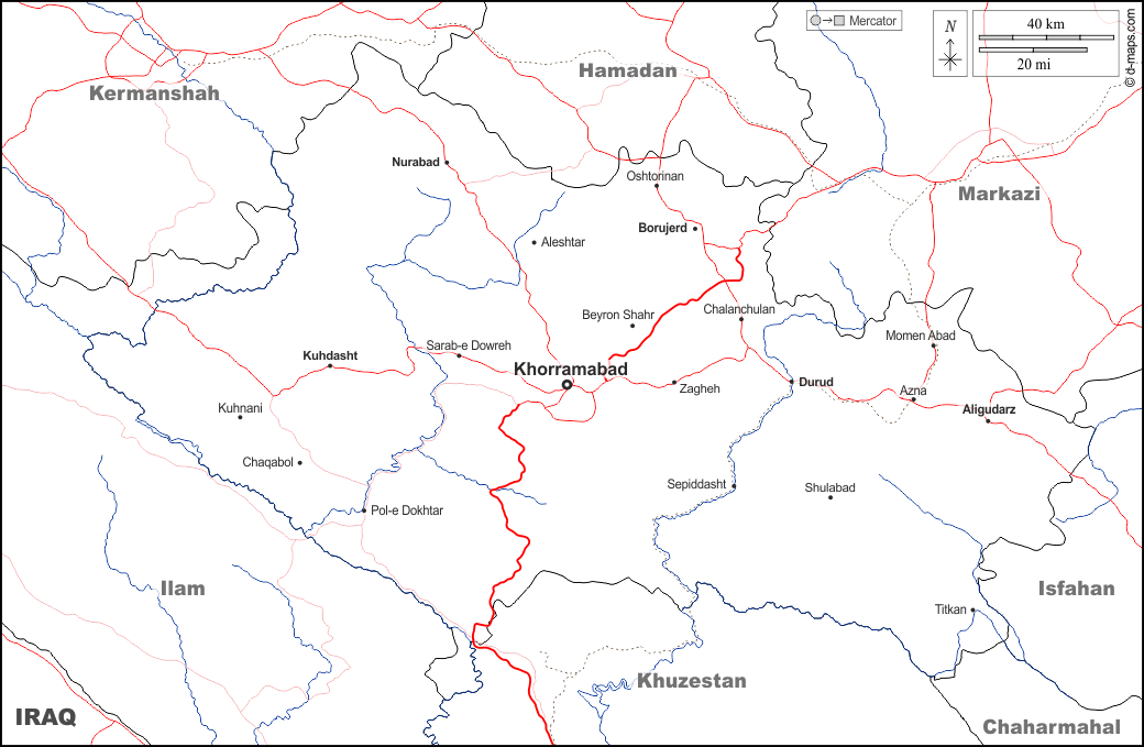 d-maps > एशिया > ईरान > लूरिस्तान > सीमाओं, जल-सर्वेक्षण, मुख्य शहरों, सड़कों, नाम, सफेद