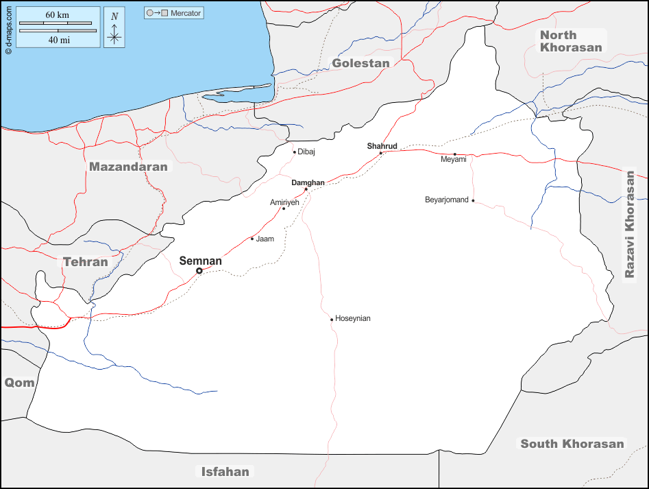 d-maps > एशिया > ईरान > सेमनान प्रांत > सीमाओं, जल-सर्वेक्षण, मुख्य शहरों, सड़कों, नाम