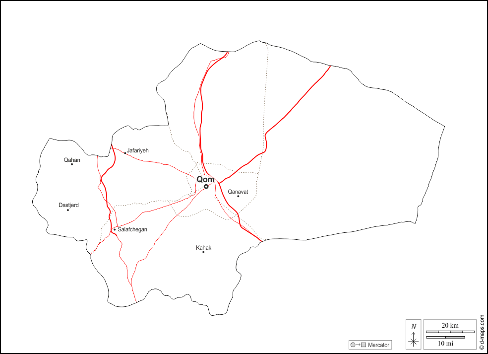 d-maps > एशिया > ईरान > क़ोम प्रांत > बाह्यरेखा, मुख्य शहरों, सड़कों, नाम, सफेद