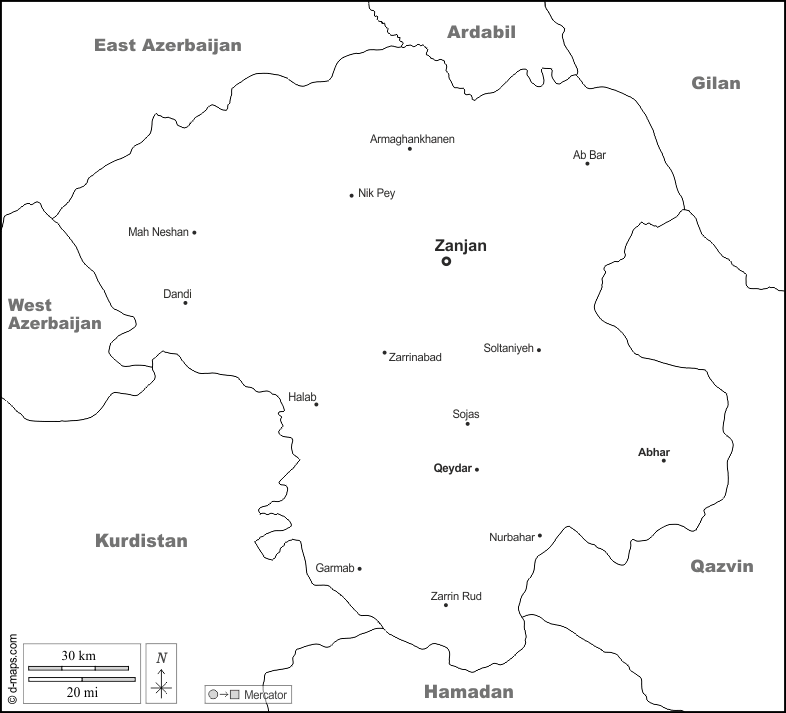 d-maps > एशिया > ईरान > ज़ंजन प्रांत > सीमाओं, मुख्य शहरों, नाम, सफेद