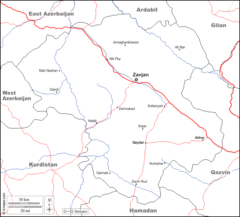 d-maps > एशिया > ईरान > ज़ंजन प्रांत > सीमाओं, जल-सर्वेक्षण, मुख्य शहरों, सड़कों, नाम, सफेद