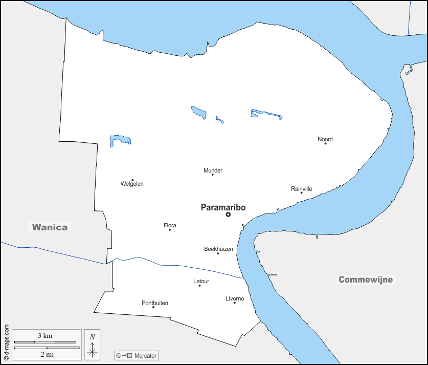 d-maps > महाअमेरिका > सूरीनाम > पारामरिबो > सीमाओं, जल-सर्वेक्षण, मुख्य शहरों, नाम