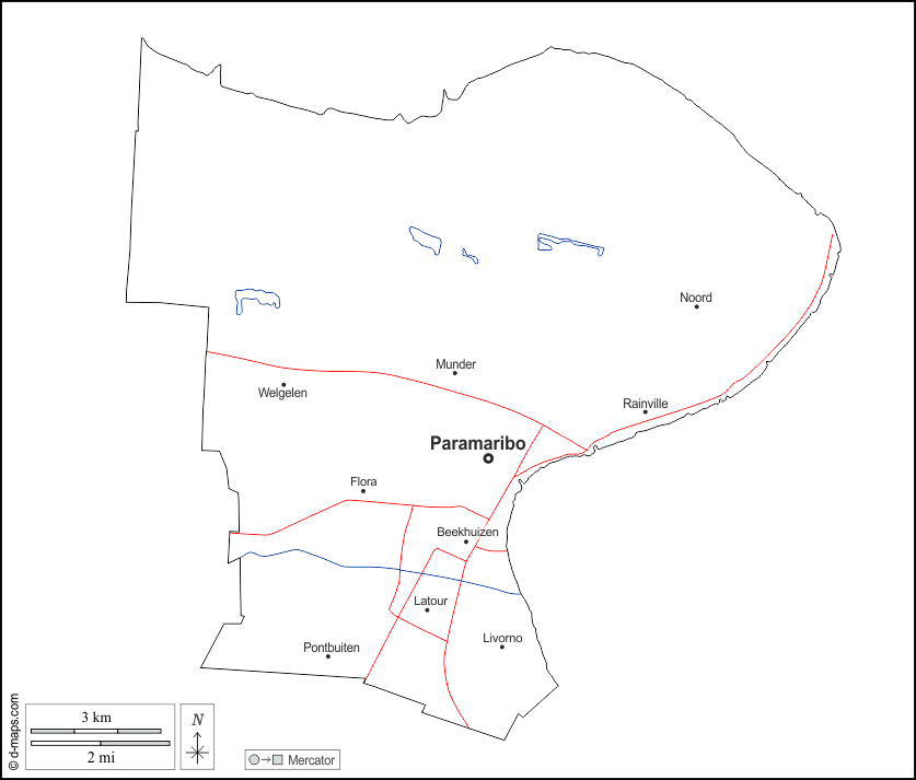 d-maps > महाअमेरिका > सूरीनाम > पारामरिबो > बाह्यरेखा, जल-सर्वेक्षण, मुख्य शहरों, सड़कों, नाम, सफेद