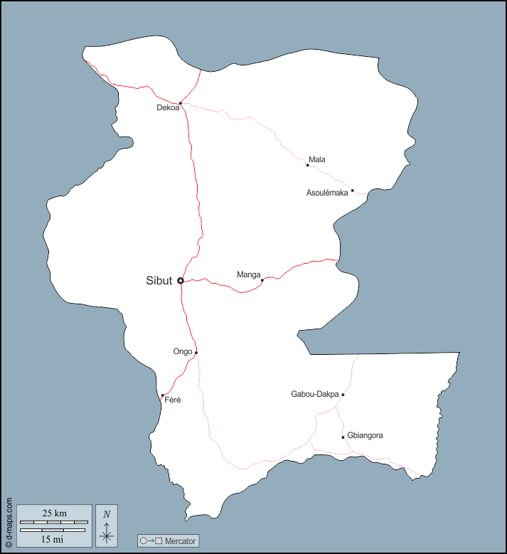 d-maps > अफ्रीका > मध्य अफ़्रीकी गणराज्य > केमो > बाह्यरेखा, मुख्य शहरों, सड़कों, नाम