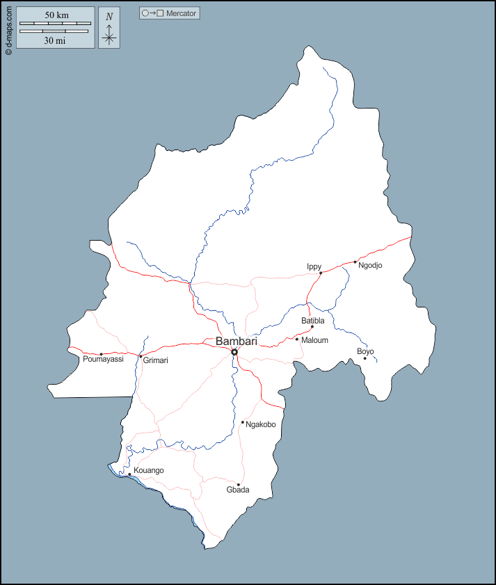 d-maps > अफ्रीका > मध्य अफ़्रीकी गणराज्य > ओआका > बाह्यरेखा, जल-सर्वेक्षण, मुख्य शहरों, सड़कों, नाम