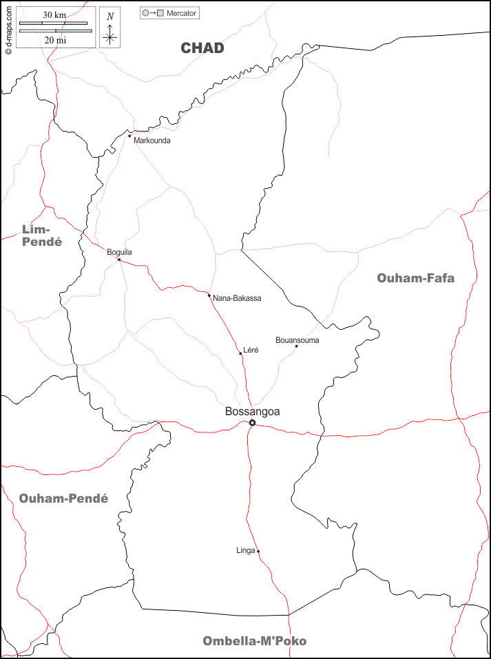 d-maps > अफ्रीका > मध्य अफ़्रीकी गणराज्य > ऑउहम > सीमाओं, मुख्य शहरों, सड़कों, नाम, सफेद