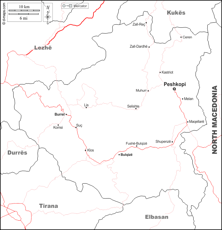 d-maps > यूरोप > अल्बानिया > डिबॅर प्रांत > सीमाओं, मुख्य शहरों, सड़कों, नाम, सफेद