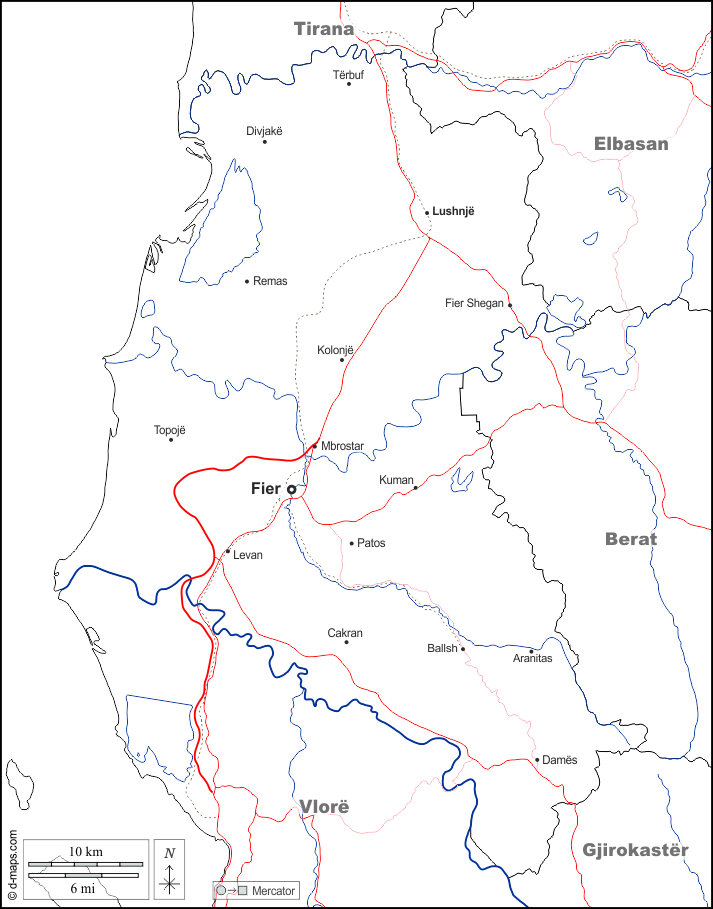d-maps > यूरोप > अल्बानिया > फ़र्न > सीमाओं, जल-सर्वेक्षण, मुख्य शहरों, सड़कों, नाम, सफेद