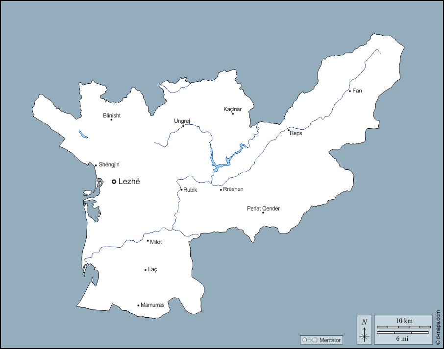 d-maps > यूरोप > अल्बानिया > लेज़ह प्रांत > बाह्यरेखा, जल-सर्वेक्षण, मुख्य शहरों, नाम