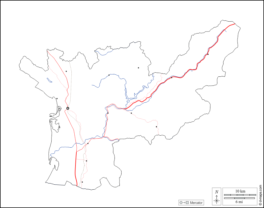 d-maps > यूरोप > अल्बानिया > लेज़ह प्रांत > बाह्यरेखा, जल-सर्वेक्षण, मुख्य शहरों, सड़कों, सफेद