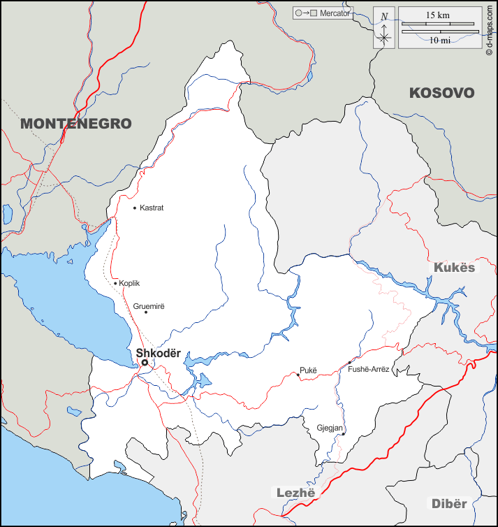 d-maps > यूरोप > अल्बानिया > श्कोडेर प्रांत > सीमाओं, जल-सर्वेक्षण, मुख्य शहरों, सड़कों, नाम