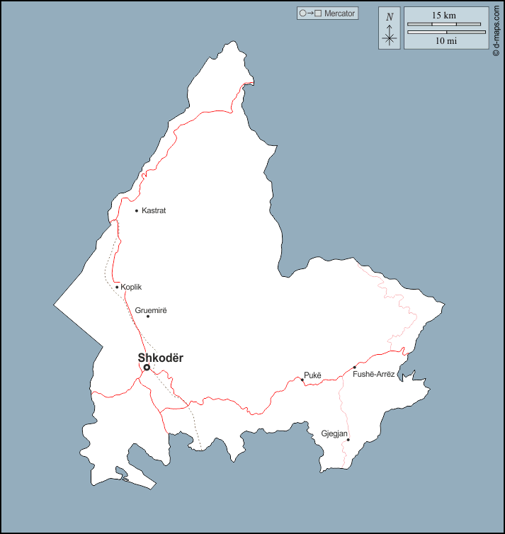 d-maps > यूरोप > अल्बानिया > श्कोडेर प्रांत > बाह्यरेखा, मुख्य शहरों, सड़कों, नाम