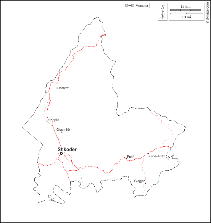 d-maps > यूरोप > अल्बानिया > श्कोडेर प्रांत > बाह्यरेखा, मुख्य शहरों, सड़कों, नाम, सफेद