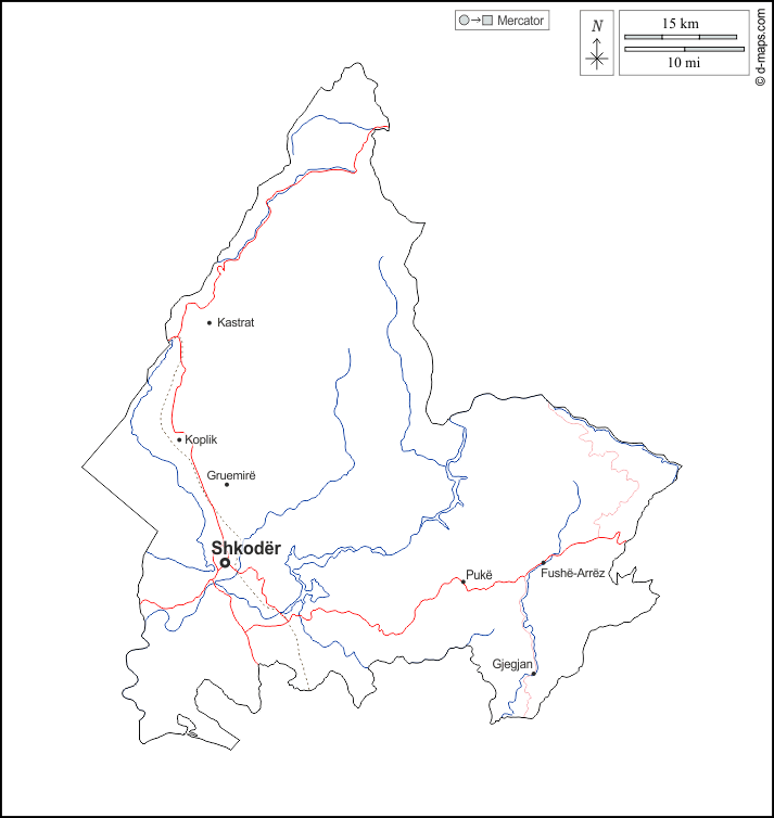 d-maps > यूरोप > अल्बानिया > श्कोडेर प्रांत > बाह्यरेखा, जल-सर्वेक्षण, मुख्य शहरों, सड़कों, नाम, सफेद