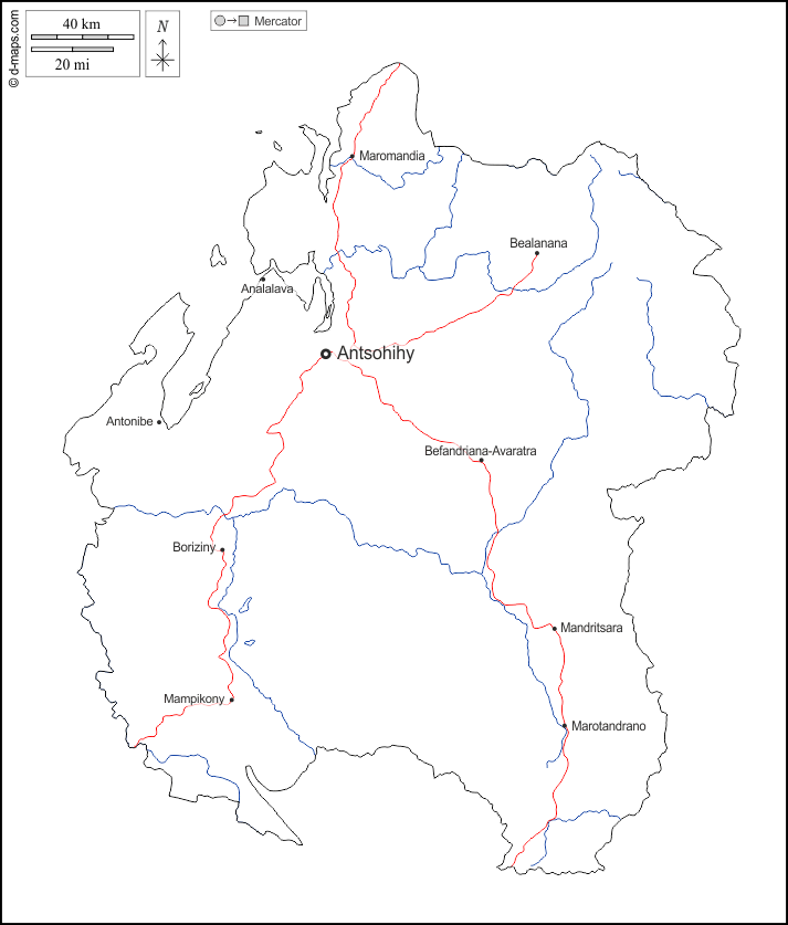 अफ्रीका > मेडागास्कर > सोफिया > बाह्यरेखा, जल-सर्वेक्षण, मुख्य शहरों, सड़कों, नाम, सफेद