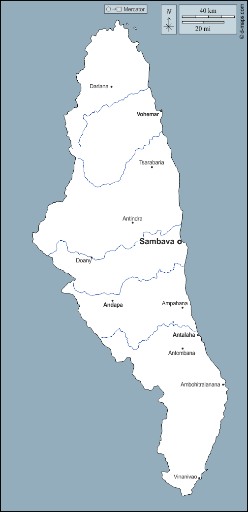 d-maps > अफ्रीका > मेडागास्कर > सावा > बाह्यरेखा, जल-सर्वेक्षण, मुख्य शहरों, नाम