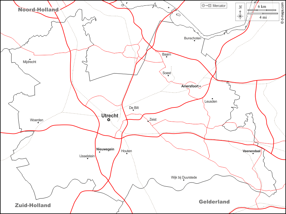 d-maps > यूरोप > नीदरलैंड > यूट्रेक्ट > सीमाओं, मुख्य शहरों, सड़कों, नाम, सफेद