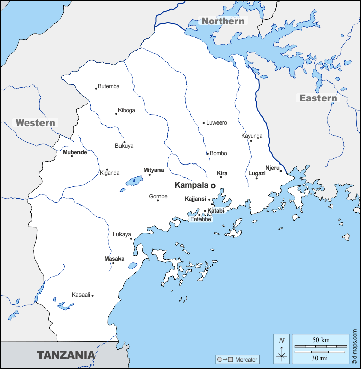 d-maps > अफ्रीका > युगांडा > केंद्रीय > सीमाओं, जल-सर्वेक्षण, मुख्य शहरों, नाम