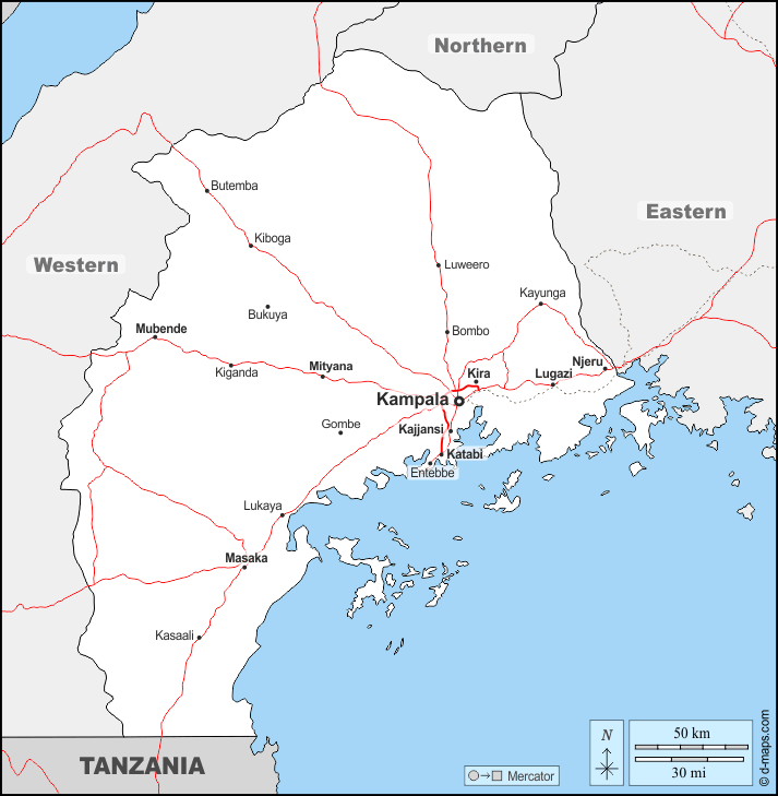 d-maps > अफ्रीका > युगांडा > केंद्रीय > सीमाओं, मुख्य शहरों, सड़कों, नाम