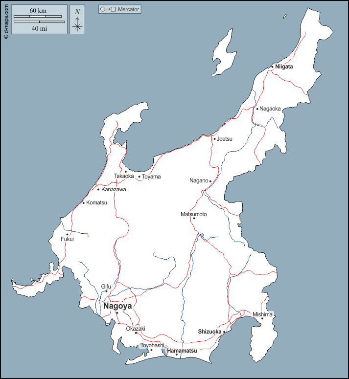 d-maps > एशिया > जापान > चुबू क्षेत्र > बाह्यरेखा, जल-सर्वेक्षण, मुख्य शहरों, सड़कों, नाम