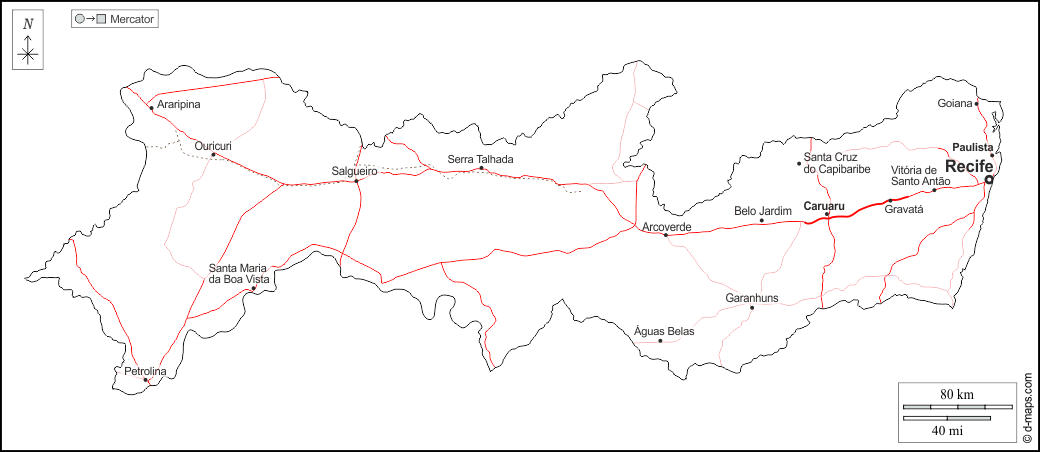 d-maps > महाअमेरिका > ब्राज़ील > पेरनाम्बुको राज्य > बाह्यरेखा, मुख्य शहरों, सड़कों, नाम, सफेद
