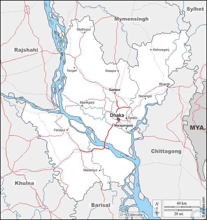 d-maps > एशिया > बांग्लादेश > ढाका विभाग > सीमाओं, जल-सर्वेक्षण, मुख्य शहरों, सड़कों, नाम