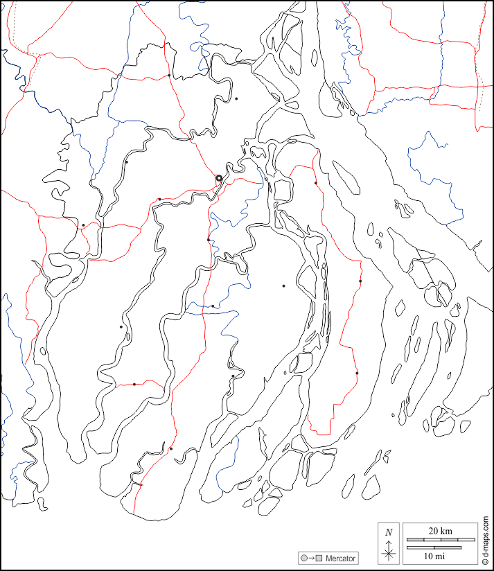 d-maps > एशिया > बांग्लादेश > बरिशाल विभाग > सीमाओं, जल-सर्वेक्षण, मुख्य शहरों, सड़कों, सफेद