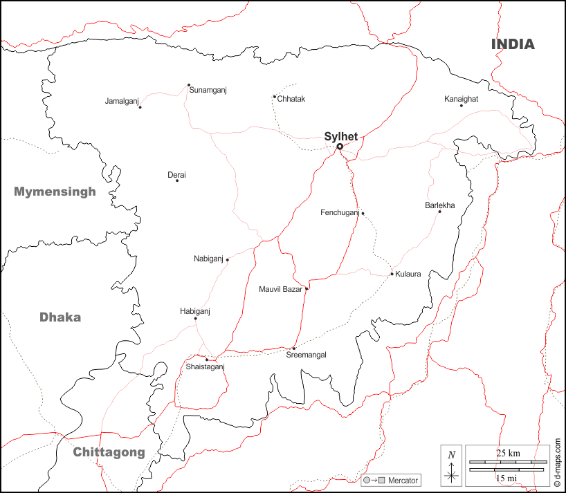 d-maps > एशिया > बांग्लादेश > सिलहट विभाग > सीमाओं, मुख्य शहरों, सड़कों, नाम, सफेद