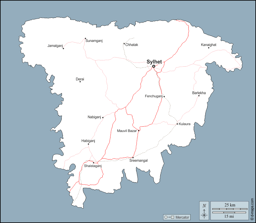 d-maps > एशिया > बांग्लादेश > सिलहट विभाग > बाह्यरेखा, मुख्य शहरों, सड़कों, नाम