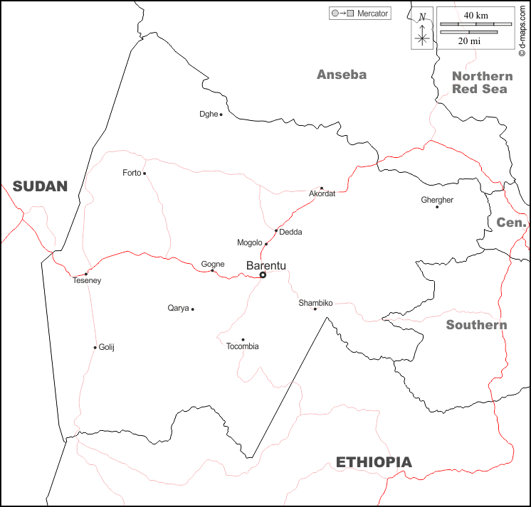 d-maps > अफ्रीका > इरीट्रिया > ग़श-बर्क > सीमाओं, मुख्य शहरों, सड़कों, नाम, सफेद