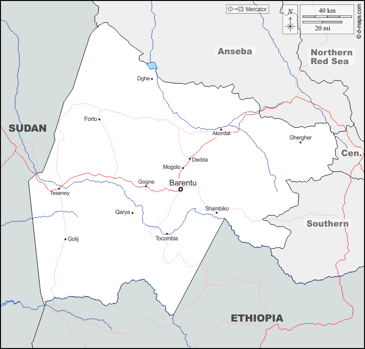 d-maps > अफ्रीका > इरीट्रिया > ग़श-बर्क > सीमाओं, जल-सर्वेक्षण, मुख्य शहरों, सड़कों, नाम