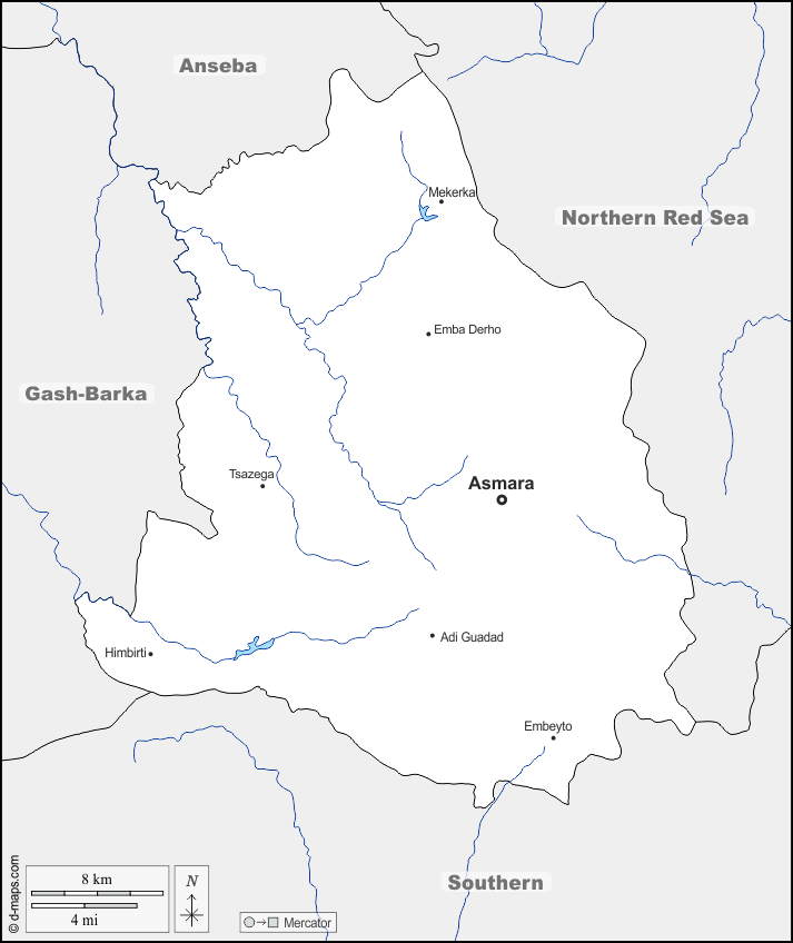 d-maps > अफ्रीका > इरीट्रिया > केन्द्रीय क्षेत्र > सीमाओं, जल-सर्वेक्षण, मुख्य शहरों, नाम