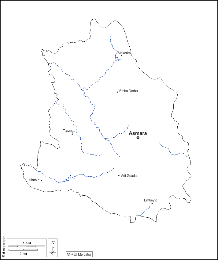 d-maps > अफ्रीका > इरीट्रिया > केन्द्रीय क्षेत्र > बाह्यरेखा, जल-सर्वेक्षण, मुख्य शहरों, नाम, सफेद
