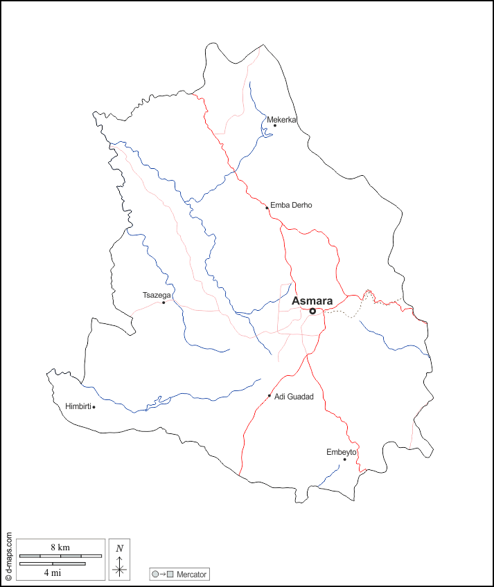 d-maps > अफ्रीका > इरीट्रिया > केन्द्रीय क्षेत्र > बाह्यरेखा, जल-सर्वेक्षण, मुख्य शहरों, सड़कों, नाम, सफेद