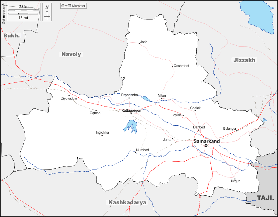 d-maps > एशिया > उज़्बेकिस्तान > समरक़न्द प्रान्त > सीमाओं, जल-सर्वेक्षण, मुख्य शहरों, सड़कों, नाम