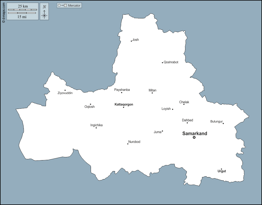 d-maps > एशिया > उज़्बेकिस्तान > समरक़न्द प्रान्त > बाह्यरेखा, मुख्य शहरों, नाम
